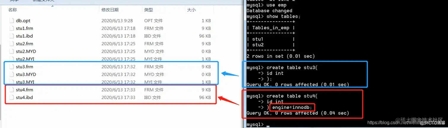 一个数据库对应一个文件夹,一个表对应两个个或多个文件,主要取决与引擎,引擎是innodb,生成一个文件。引擎是myisam生成3个文件: