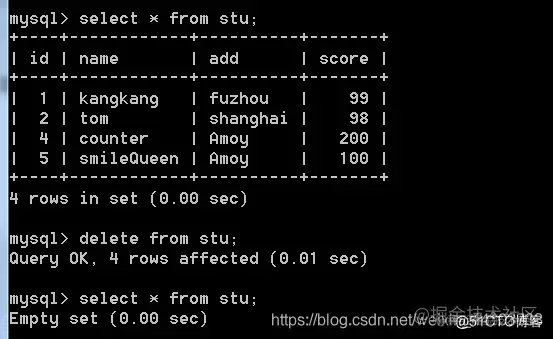 删除表中所有数据:delete from 表名 ; 或者 truncate table 表名;