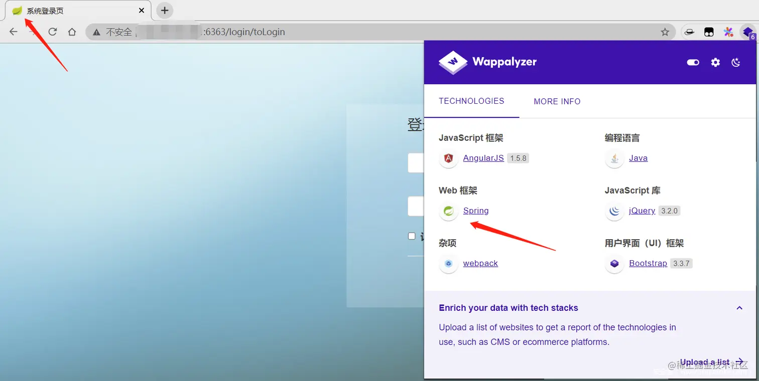 继续看一下6363端口的服务,推荐大家使用Wappalyzer对站点框架信息快速收集,下图中可以直接通过 Wappalyzer 得知目标环境,当然上面 “小绿叶” 的 ICO 图标也可以看出是SpringBoot的框架。