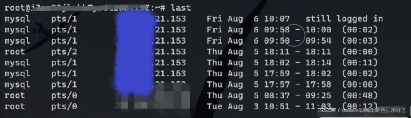 当然,查看日志也发现了, 另一个登录的IP为企业专线,这也解释了,目标服务器的登录应该是做了安全组限制了登录SSH服务的网段仅能从其企业内网连接。