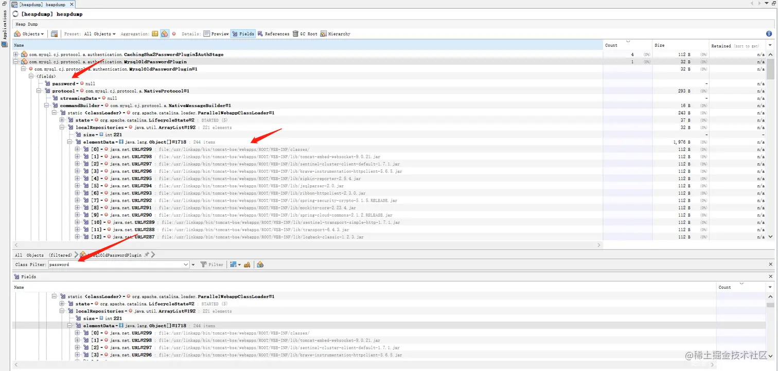 可能小伙伴会问,如果恰好没有开放/jolokia这个端点呢?确实在很多情况下,并不一定都会开放这个端点。所以此时可以关注一下/heapdump,通过下载本端点的文件可获取到服务器相关堆信息,通过对该文件进行审计也可能获取到经过脱敏处理的数据,可以使用MemoryAnalyzer或者VisualVM打开该文件,这里经过测试发现我们想获取到的属性值都经过了二层加密,所以就不进行审计了,下面贴一张图。