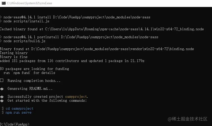 cd oamyproject,然后输入 npm run serve 运行vue项目