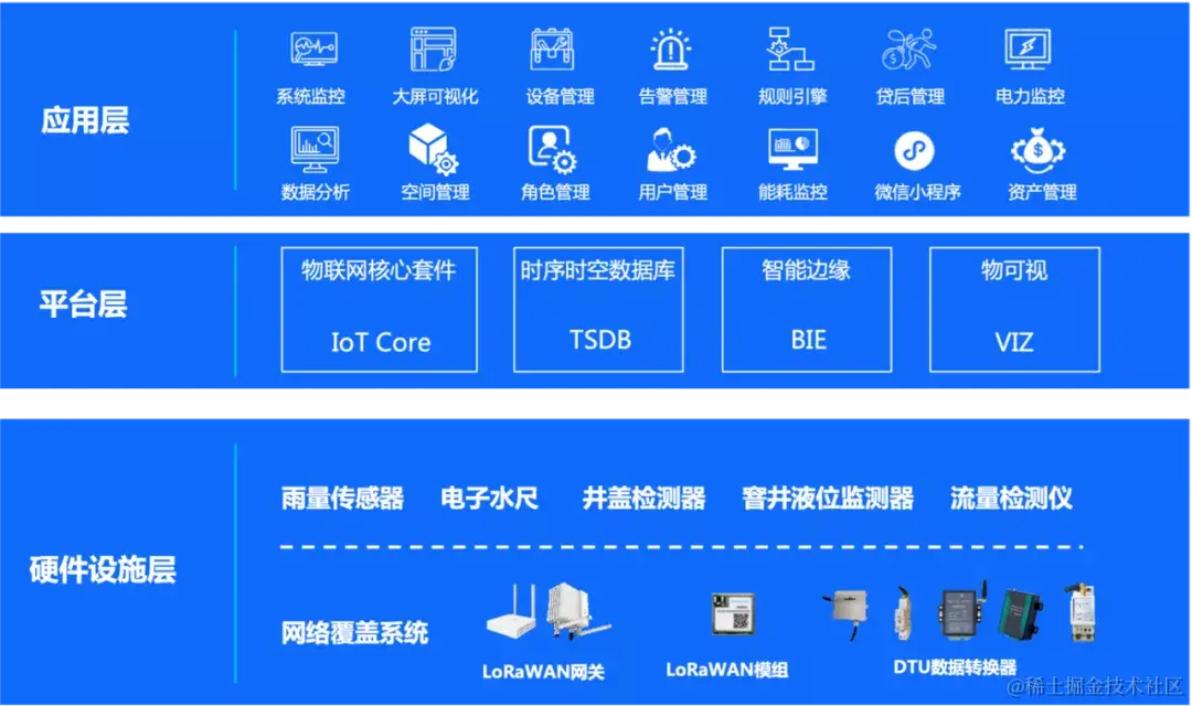 在硬件设施层,该方案覆盖降水、积水、井盖、蓄水、排水五个方面: 通过雨量传感器及电子水尺可以测量降雨量和积水深度;井盖检测器和窨井液位监测器可实时监测井盖异动及窨井液位高度;流量监测仪实现监测管网、排口处的流量;最后,通过数据传输模块可将设备串口数据转成无线传输。