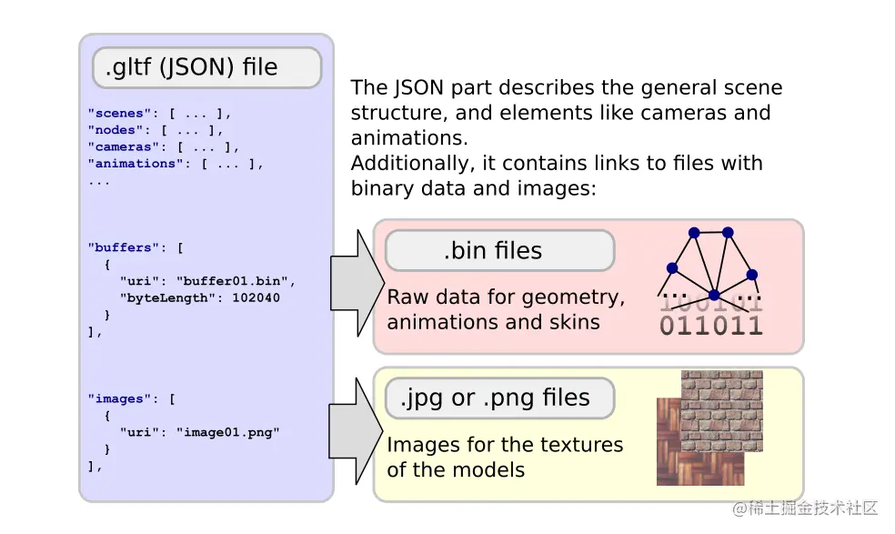 - glTF JSON 指向外部二进制数据(几何、关键帧、皮肤)和图像。