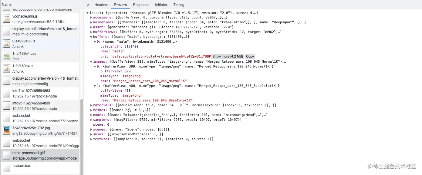 对于这些资源,由于 base64 编码,glTF 需要单独的请求或额外的空间。Base64 编码需要额外的处理来解码并增加文件大小(编码资源增加约 33%)。虽然 gzip 减轻了文件大小的增加,但解压缩和解码仍然会增加大量的加载时间。