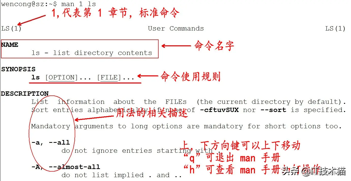 如,我们想查看 ls 的用法:man 1 ls ( 1:为数字"1",代表第 1 个 section,标准命令 )