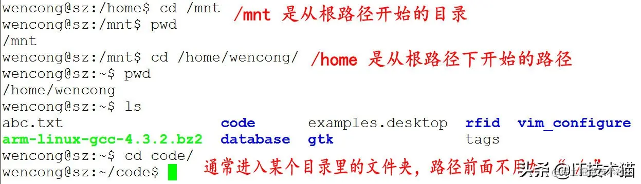 注意: 如果路径是从根路径开始的,则路径的前面需要加上 " / ",如 " /mnt ",通常进入某个目录里的文件夹,前面不用加 " / "。