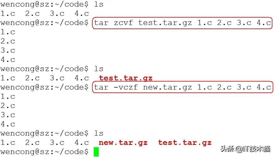 例如:tar zcvf test.tar.gz 1.c 2.c 3.c 4.c把 1.c 2.c 3.c 4.c 压缩成 test.tar.gz