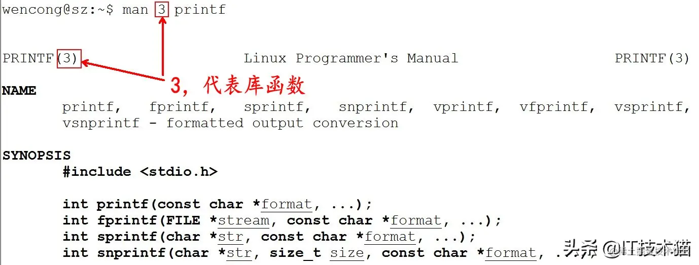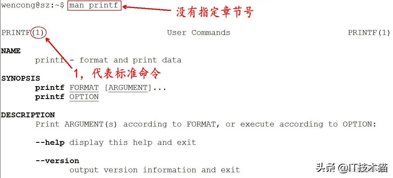 实际上,我们不用指定第几个章节也用查看,如,man ls。但是,有这个一种情况,假如,命令的名字和函数的名字刚好重名(如:printf),它既是命令,也可以是库函数,如果,我们不指定章节号,man printf,它只查看命令的用法,不会查询函数的用法,因为 man 是按照手册的章节号的顺序进行搜索的。