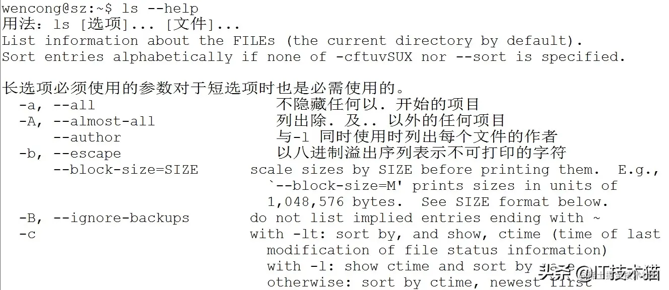 如我们想查看命令 ls 的用法:ls --help