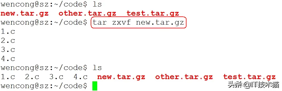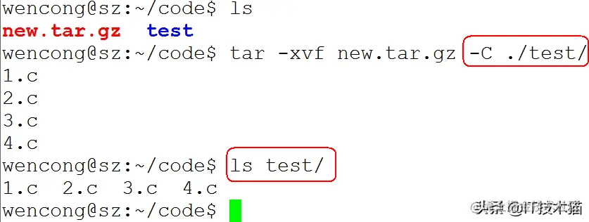 例子:tar -xvf new.tar.gz -C ./test/ 将 new.tar.gz 解压到当前目录下的 test 目录下:
