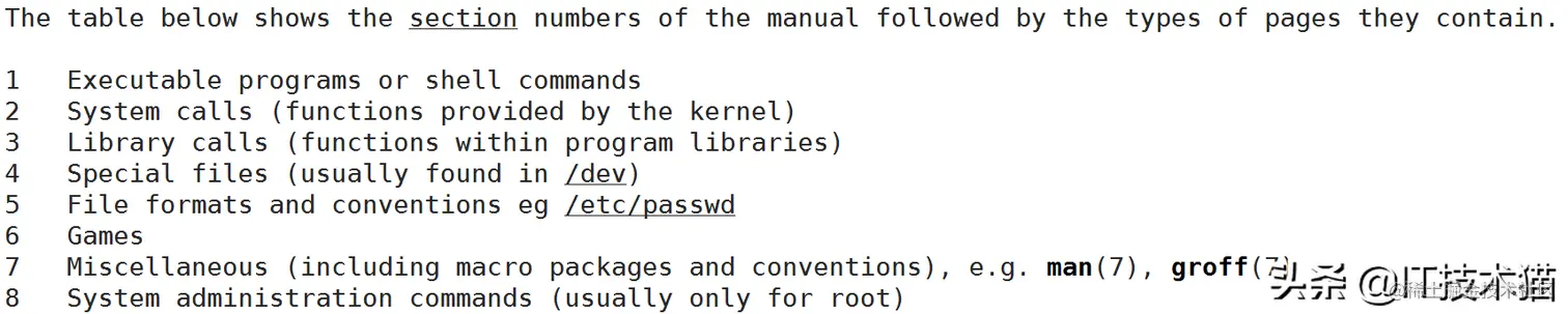 该手册分成很多章节(section),使用 man 时可以指定不同的章节来浏览不同的内容。