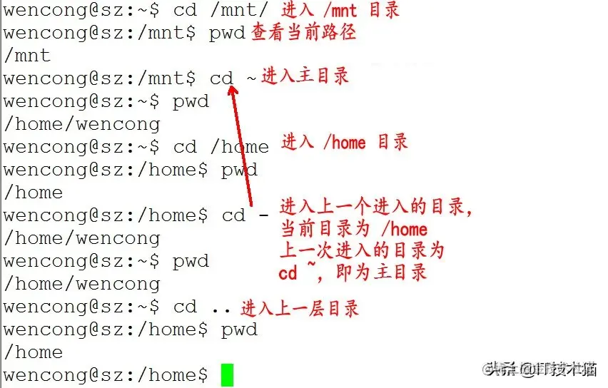cd后面可跟绝对路径,也可以跟相对路径。如果省略目录,则默认切换到当前用户的主目录。