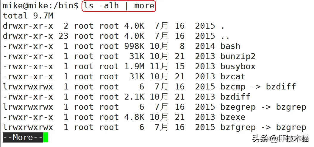 查看内容时,在信息过长无法在一屏上显示时,会出现快速滚屏,使得用户无法看清文件的内容,此时可以使用more命令,每次只显示一页,按下空格键可以显示下一页,按下q键退出显示,按下h键可以获取帮助。