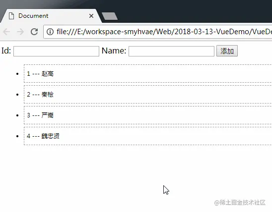 add() { this.list.push({ id: this.id, name: this.name }) this.id = this.name = '' },