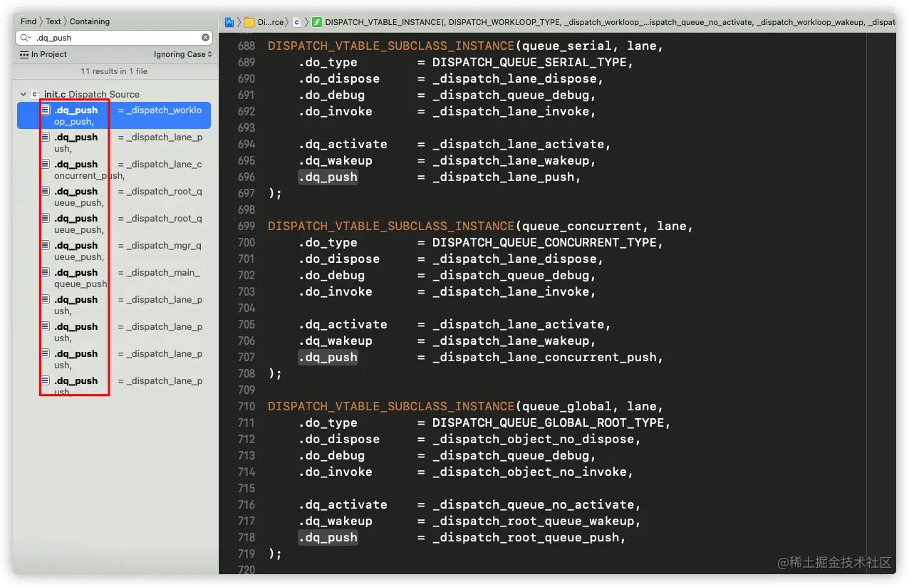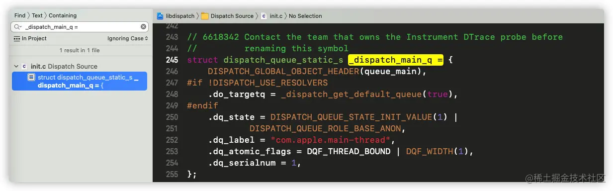也就是说dispatch_queue_main_t是类型,_dispatch_main_q才是它真正的对象;那么我们搜索_dispatch_main_q =来寻找_dispatch_main_q的赋值: