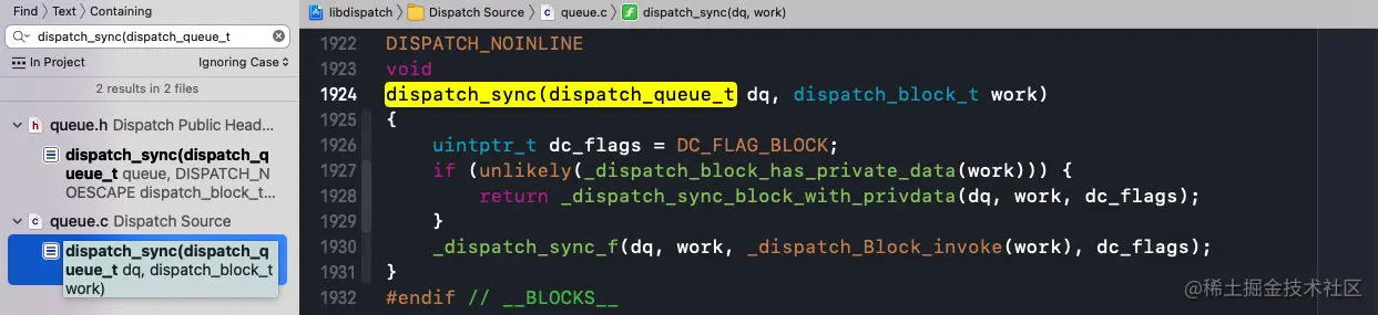 然后在源码中搜索dispatch_sync(dispatch_queue_t可以找到其实现:
