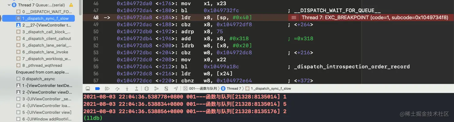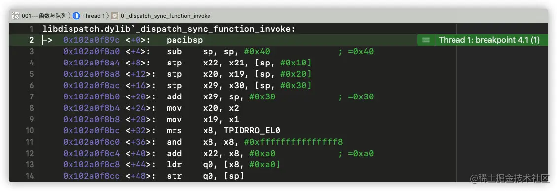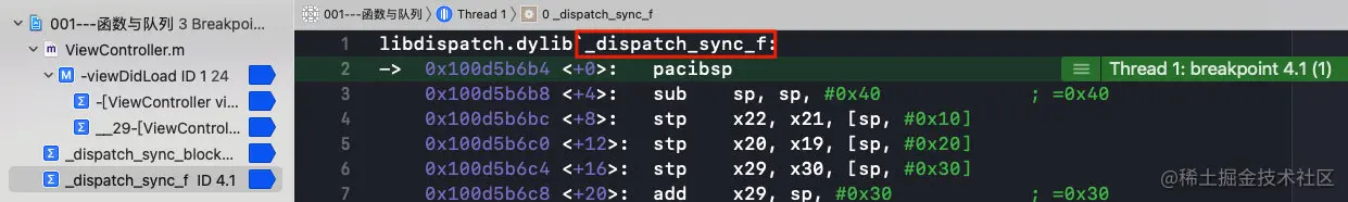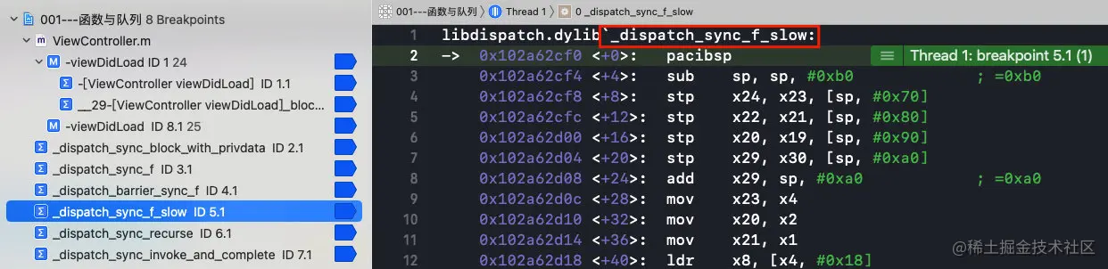 此方法中和ctxt与func有关的方法有两个_dispatch_sync_function_invoke和_dispatch_sync_invoke_and_complete_recurse,分别下符号断点,继续运行: