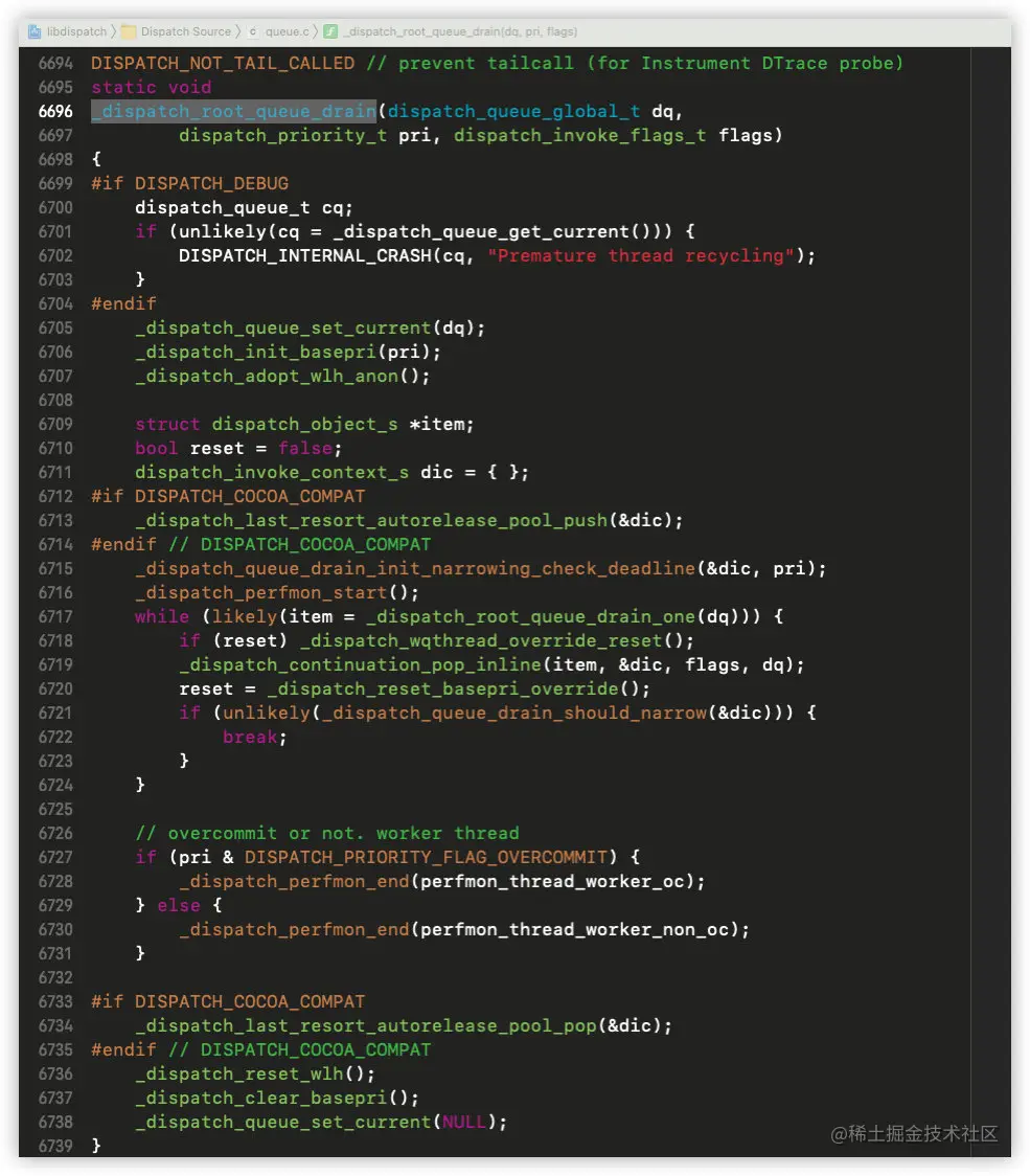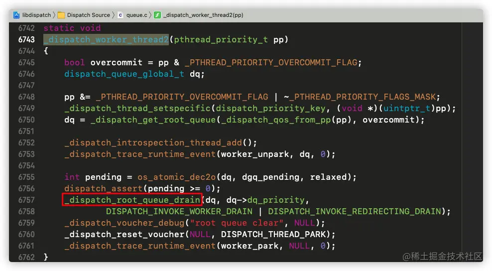 这里调用了_dispatch_root_queue_drain,进入其实现: