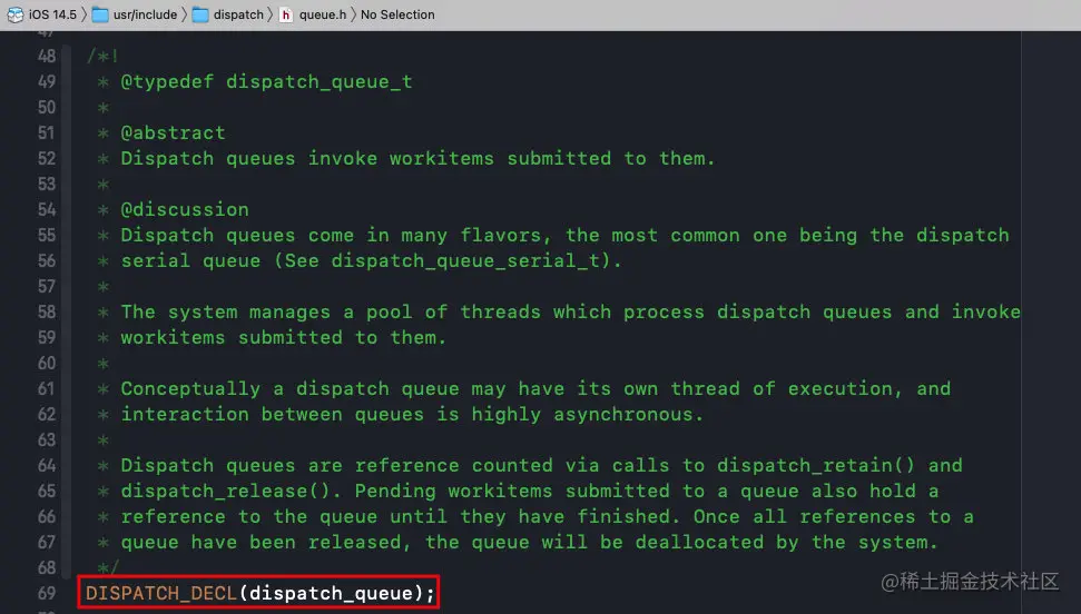 dispatch_queue_t是一个类型,这个类型来自于dispatch_queue_s类型的结构体;而结构体有继承自dispatch_object_s;