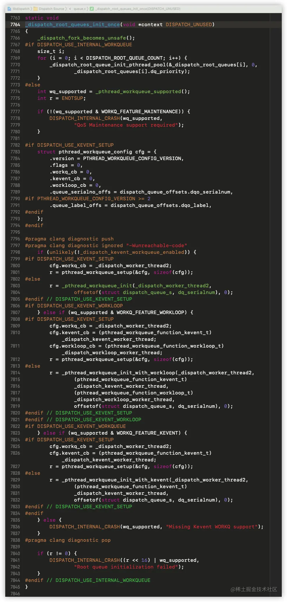 _dispatch_root_queue_init_pthread_pool:判断当前可调度线程池的状况;pthread_workqueue_config:工作队列的配置信息;