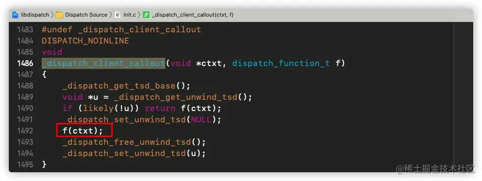 但是在这个方法中并没有任何地方调用_dispatch_queue_override_invoke,那么一定是方法体内的某一个方法调用了_dispatch_queue_override_invoke,经过查看我们发现是_dispatch_continuation_pop_inline调用了_dispatch_continuation_invoke_inline,然后调用了_dispatch_client_callout,而_dispatch_client_callout最终实现为: