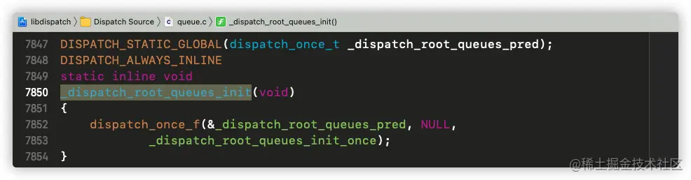 此方法过于庞大,我们无从入手,但是我们发现有一个初始化方法_dispatch_root_queues_init,我们试着看看这个方法的实现: