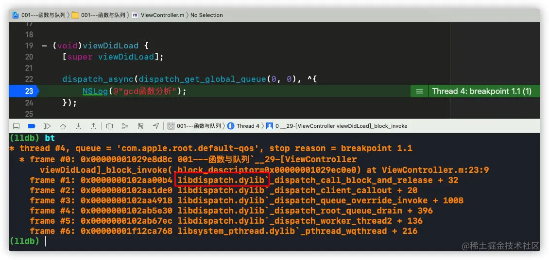 可以发现,测试代码中block的_block_invoke来自于libdispatch.dylib中的_dispatch_call_block_and_release;