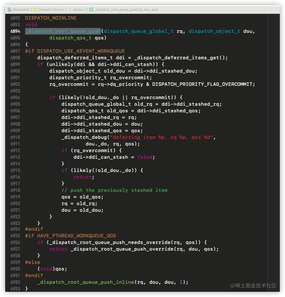 针对队列的不同,赋值不同的值,全局并发队列赋值情况为_dispatch_root_queue_push,搜索定位: