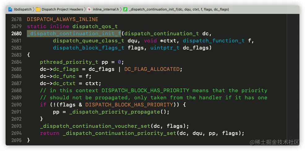 在这里ctxt和f分别赋值给了dc的dc_ctxt和dc_func两个成员变量,进入_dispatch_continuation_priority_set函数: