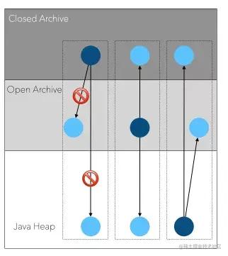 - Closed Archive不允许引用Open Archive 和Heap中的对象可以引用Closed Archive内部的对象只读,不可写