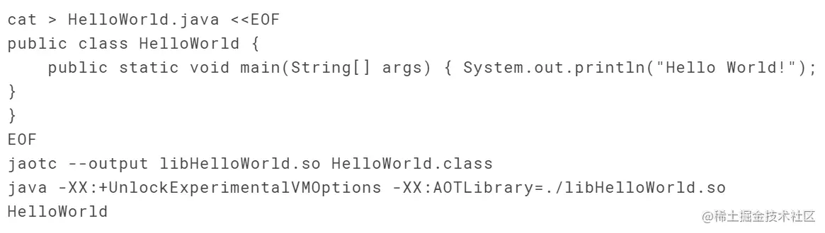 jaotc 命令会调用Graal编译器对字节码进行编译,产生 libHelloWorld.so 文件。这里产生的so文件容易让人误以为会直接像JNI一样调用进编译好的库代码。但是这里并没有完全使用ld的加载机制来运行代码,so文件更像是当做一个 native 代码的容器。hotsopt runtime 在加载 AOT so 后需要进行进一步的动态链接。在类加载后hotspot 会自动关联 AOT 代码入口,对于下次方法调用使用 AOT 版本。而 AOT 生成的代码也会主动与 hotspot 运行时交互,在aot、解释器、JIT 代码间相互跳转。