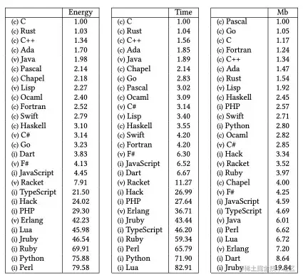 《Energy Efficiency across Programming Languages,How Does Energy, Time, and Memory Relate?》这份报告调研了各大编程语言的执行效率,虽然场景的丰富程度有限,但是也能够让我们见微知著。