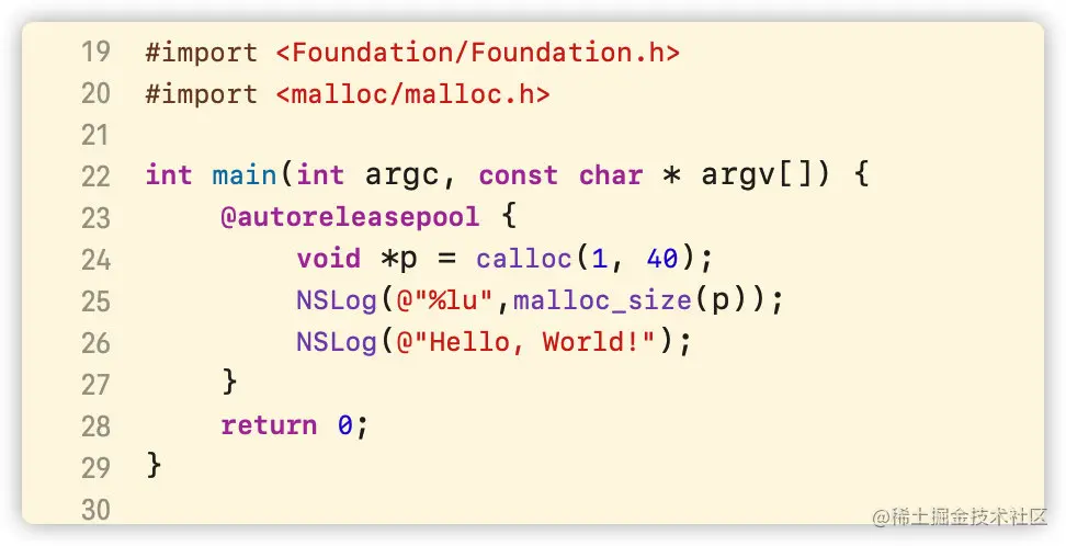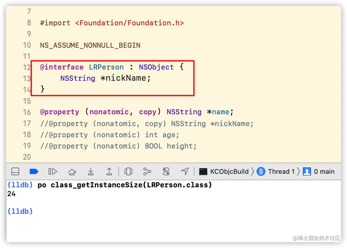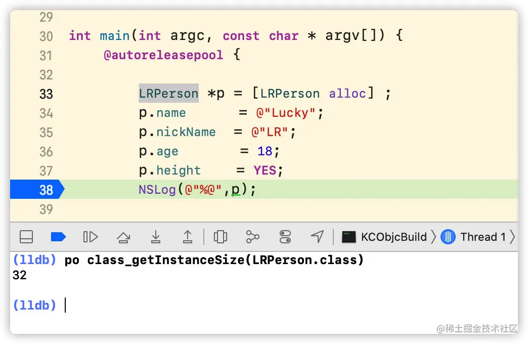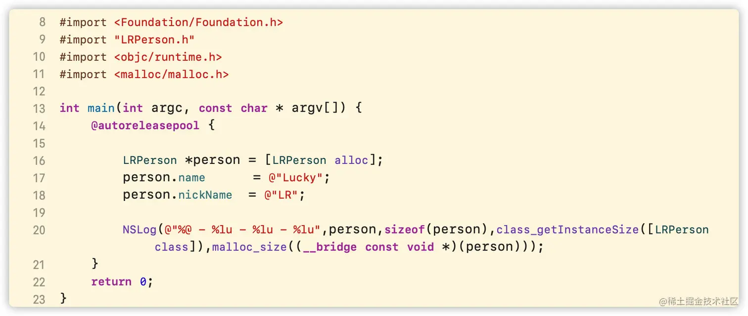 sizeof:对象类型的内存大小。person是一个对象,里面是一个指针地址,占8字节class_getInstanceSize:对象实际的内存大小。先前已经分析出内存大小是由类的成员变量的大小决定。LRPerson有四个成员变量对应字节大小为8848,8字节对齐一下为32,再加上isa的8个字节,最终结果为40malloc_size:这里结果为什么是48,不是40呢?下面我们就探索下malloc_size