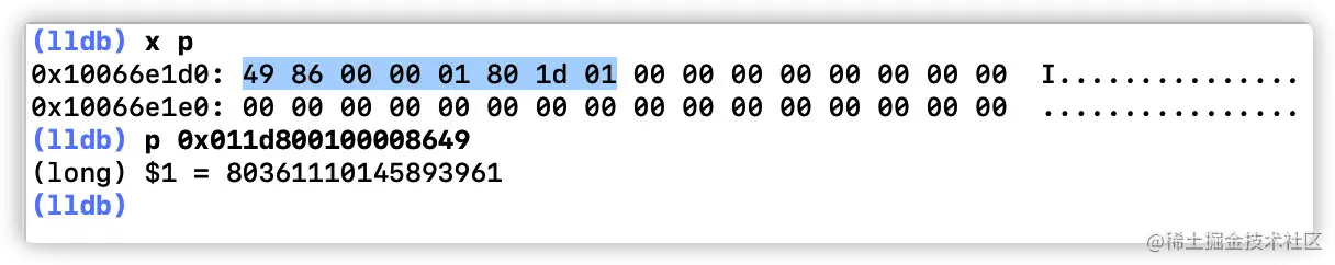 0x10066e1d0为首地址,后面则是内存。如何读取内存呢?由于iOS是小端模式,我们截取8位从后往前读取,在控制台打印出来。