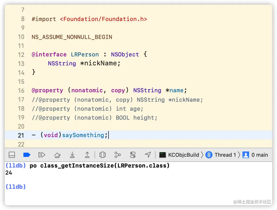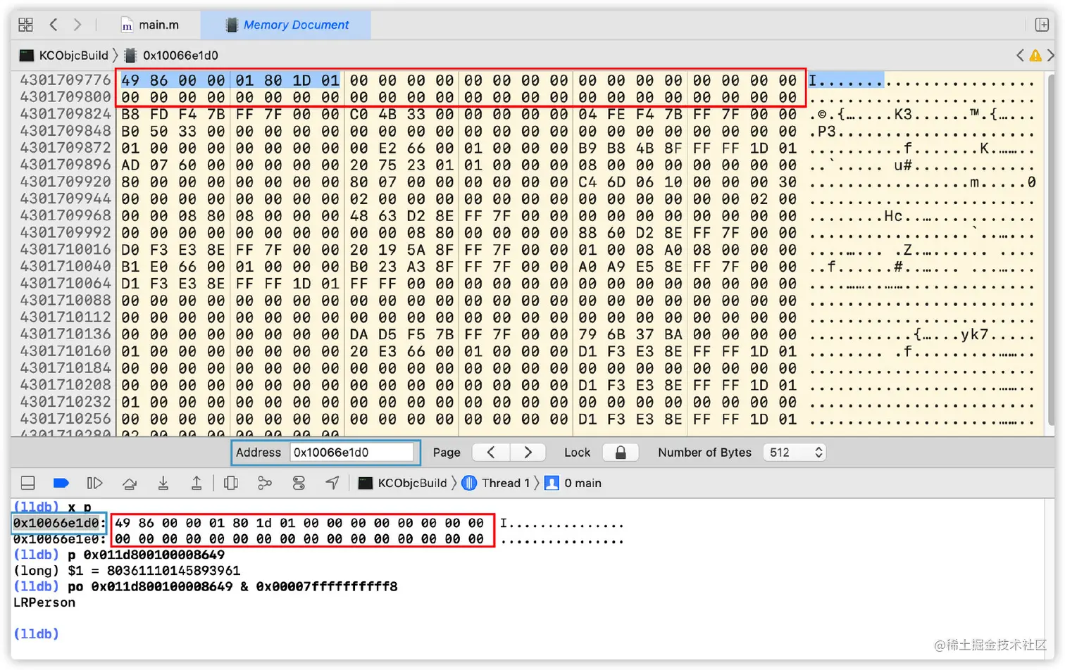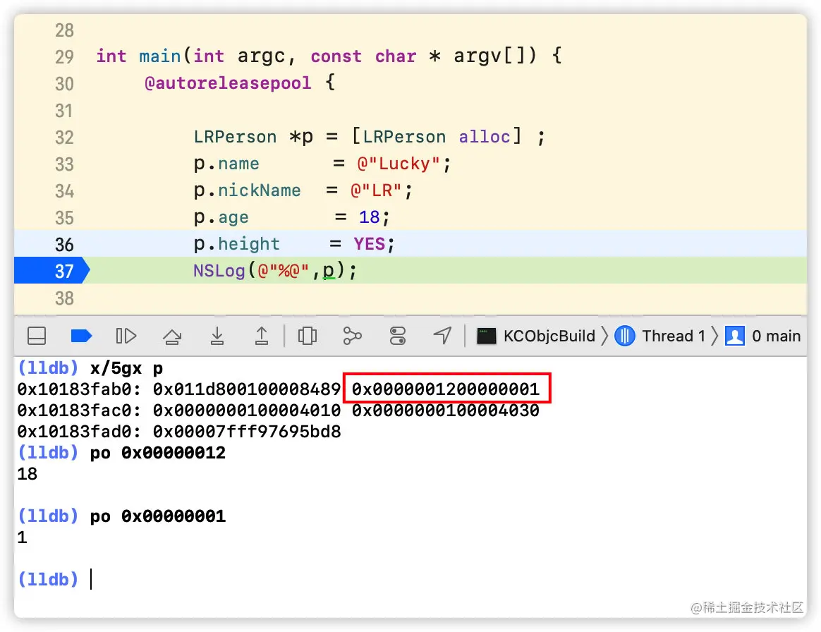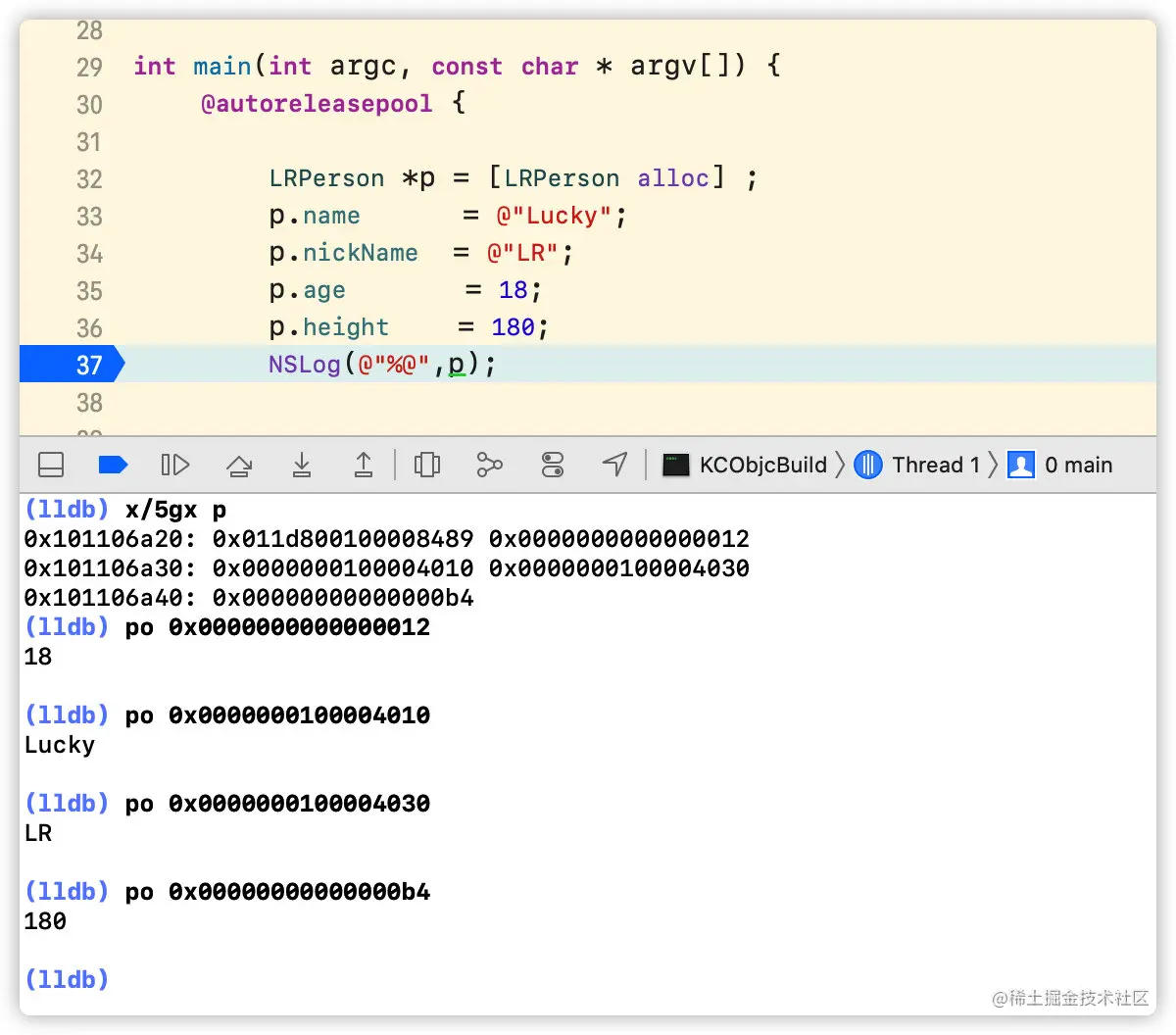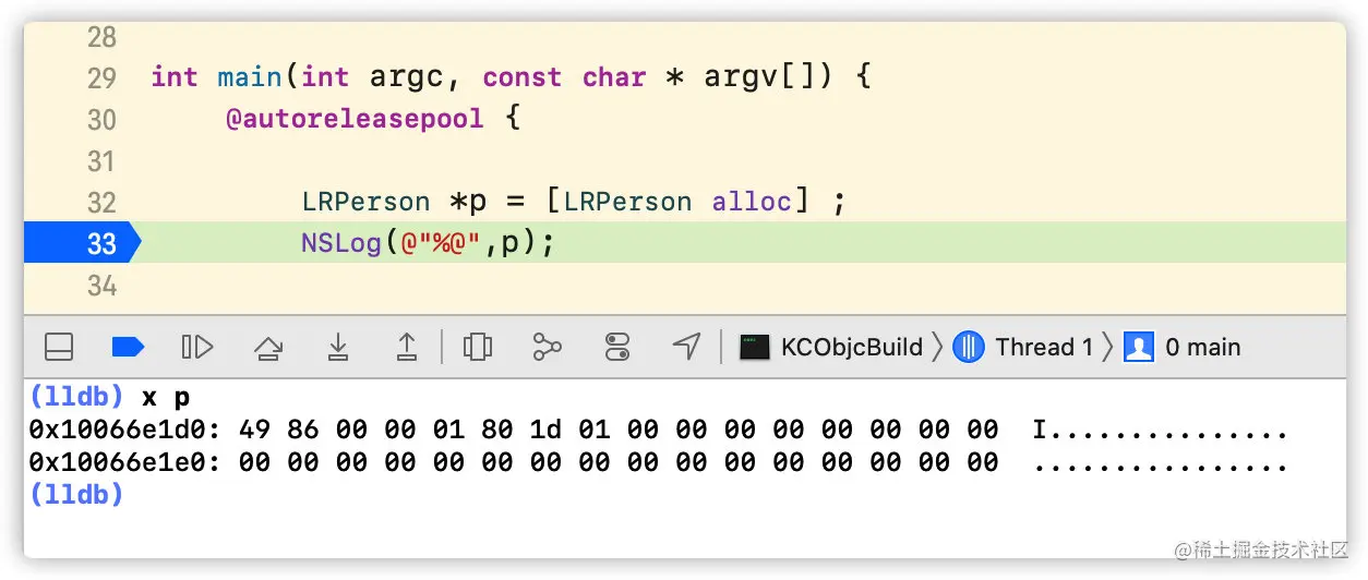 首先我们接上一篇所用的objc源码,打上断点运行。在控制台输入x p,此时可以看到p对象的内存情况。