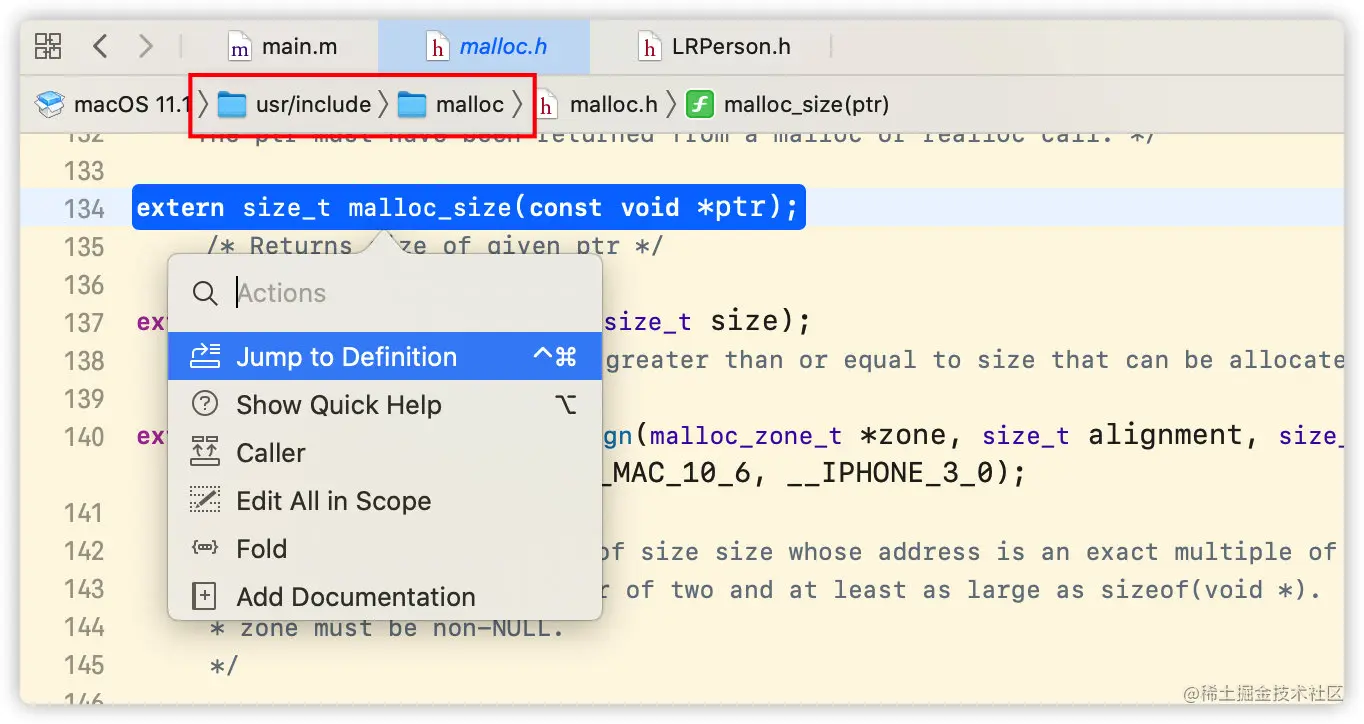 点击malloc_size无法进入查看源码,根据路径发现这个文件来自usr/include