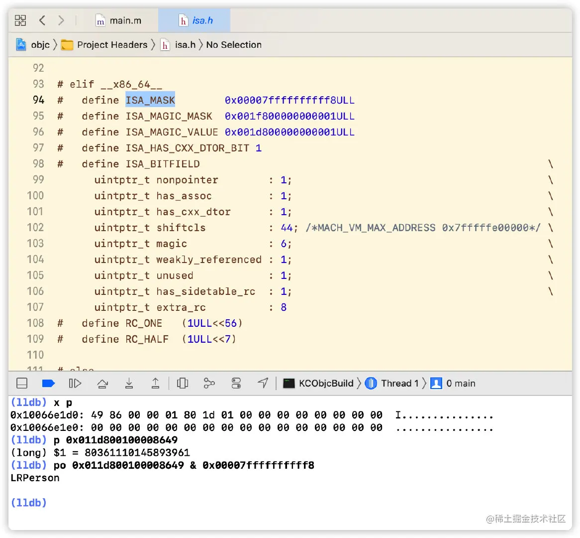 isa是首地址,但是这里看起来并不是。因为这里需要再& ISA_MASK,在源码中找到在x86_64下ISA_MASK值为0x00007ffffffffff8。& ISA_MASK后打印出正确的isa