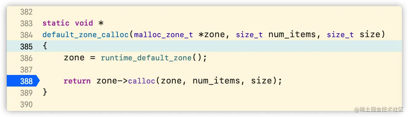 此时在这行代码下个断点,断住后control + step into跟进去(也可po zone->calloc查看(有赋值就有存储值)),进入到default_zone_calloc方法
