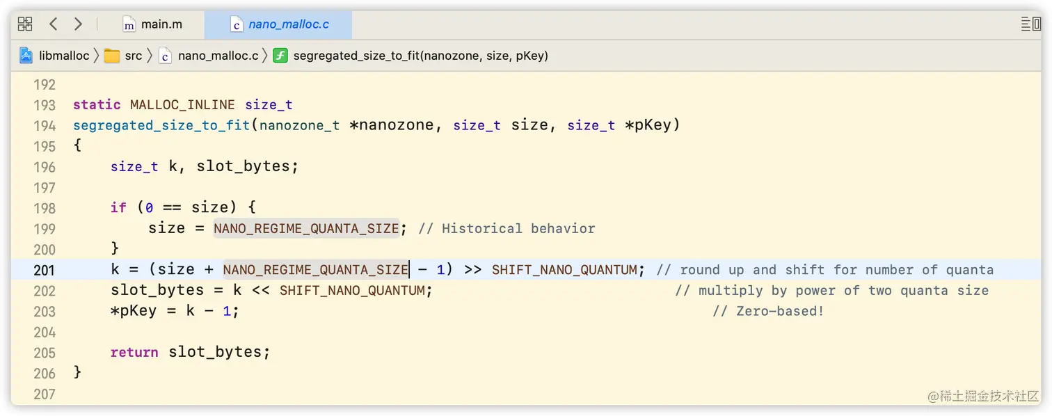 _nano_malloc_check_clear的实现中看到我们关心的内存大小size_t这行代码,这里接收了我们最开始传入的size: 40,得到结果slot_bytes为48。所以关键在segregated_size_to_fit这个方法,进去瞅一眼