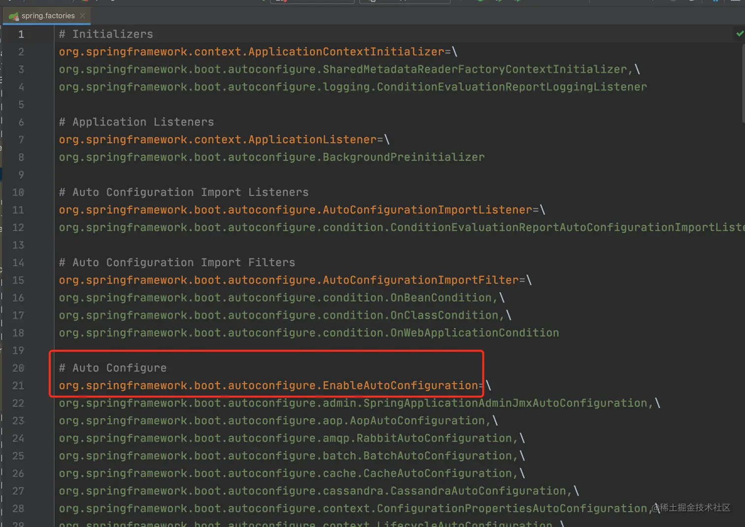 现在,配置文件我们也找到了:spring.factories,也实锤了就是通过这个配置文件进行的自动配置。
