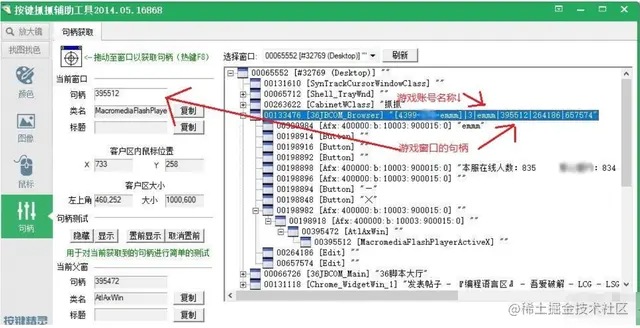 (因为我用的是36jb大厅登录的游戏,抓取句柄的时候可以根据他的title来区别游戏窗口)