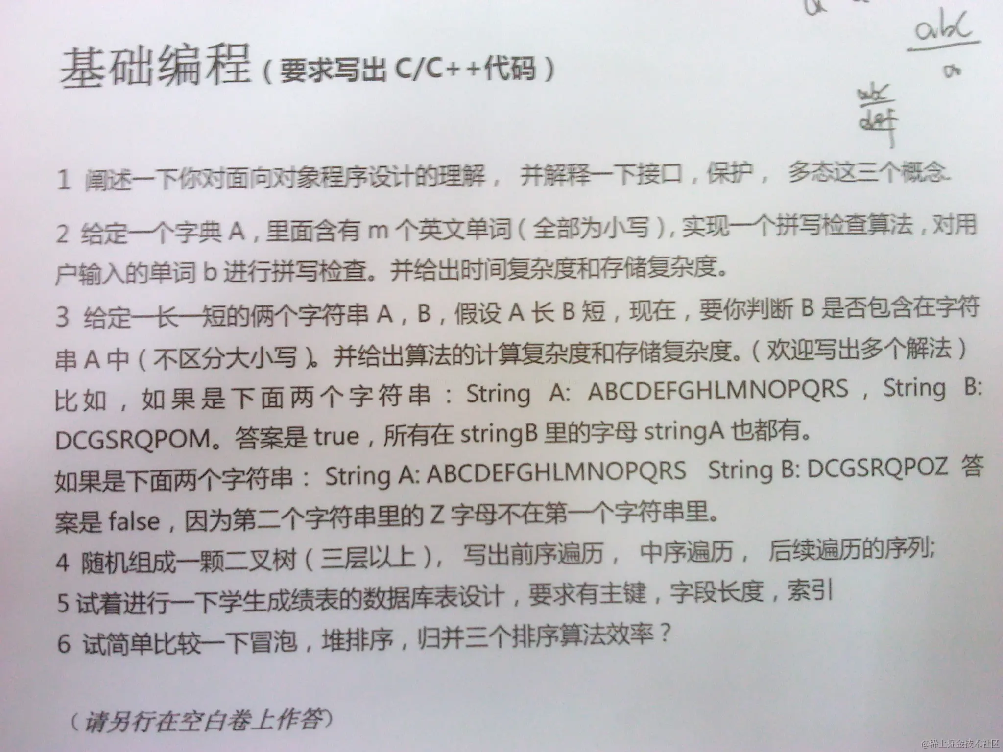 本文所整理的全部笔试面试题要么来源于我群内群友们的分享,要么摘自论坛或博客,所有原题均来自网络。虽然本文中整理的绝大部分笔试面试题偏算法(自己特意为之之故),但不论是哪一年的校招,一般说来,笔试偏基础(尤其是选择题部分,涵盖语言,计算机组成原理、操作系统、网络协议、数据库、概率期望等知识),而面试则偏算法(且极具针对性的根据简历提问),且无论是笔试还是面试,两者都很看重你的实际编程能力,希望大家知晓。