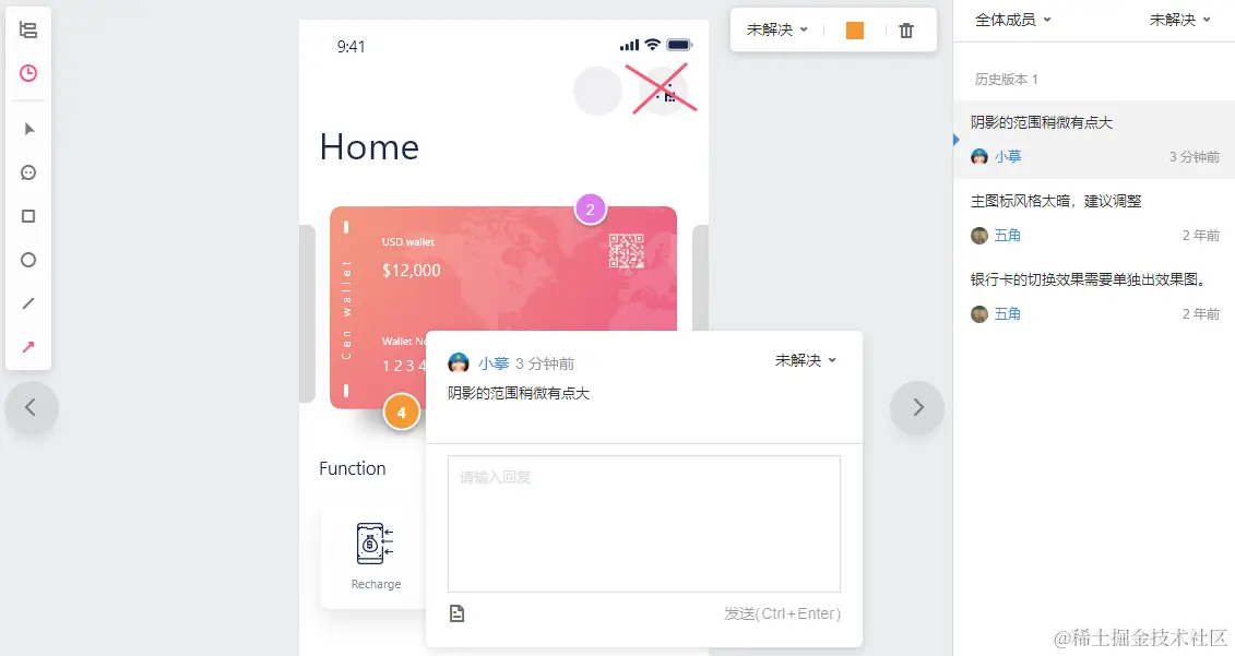 以设计稿评审环节为例,他提供了多种评审工具,参与审核的成员可以同时对设计稿进行打点评论,也可以查看和回复其他人的评论内容。设计师只需要根据所有成员的最终评审意见逐条进行修改即可。修改后还可以直接更新评论的解决状态,二次评审时其他成员可以根据评论来对照检查,问题就这样迎刃而解,效率自然也就大大提升。