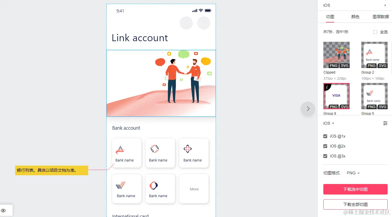 **3.标记切图:**在上传设计稿前,我们需要做好标记切图的工作,上传到后直接交付给开发工程师,开发工程师可以根据开发需求,下载不同平台不同尺寸的切图,而不用我们一张张切好再打包交付。