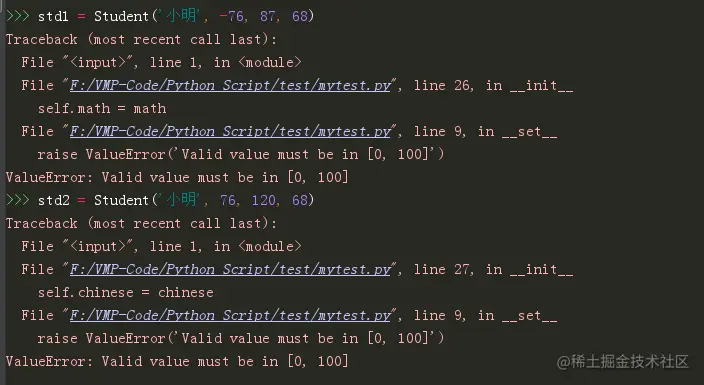 如前所述,Score 类是一个描述符,当从 Student 的实例访问 math、chinese、english这三个属性的时候,都会经过 Score 类里的三个特殊的方法。这里的 Score 避免了 使用Property 出现大量的代码无法复用的尴尬。