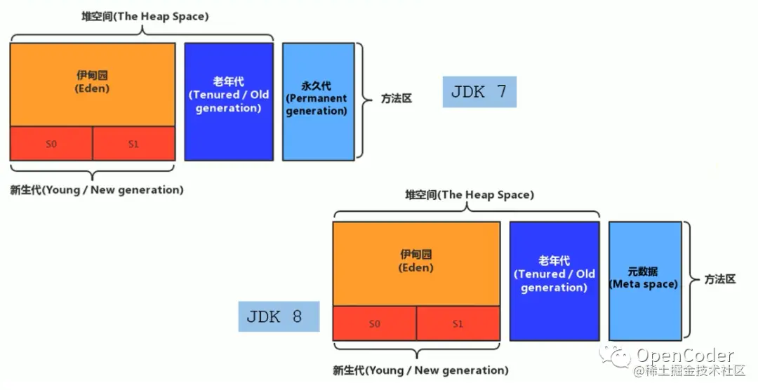 在jdk7及以前,习惯上把方法区,称为永久代。jdk8开始,使用元空间取代了永久代。