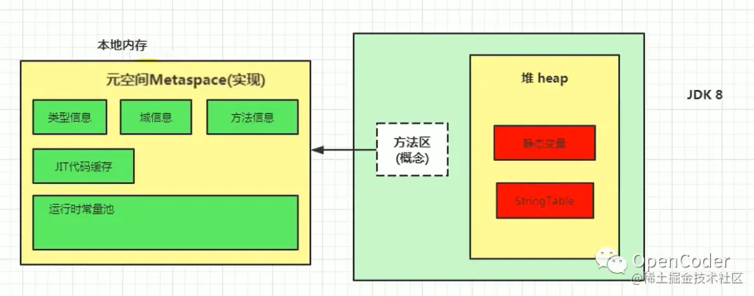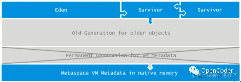 而到了JDK8,终于完全废弃了永久代的概念,改用与JRockit、J9一样在本地内存中实现的元空间(Metaspace)来代替: